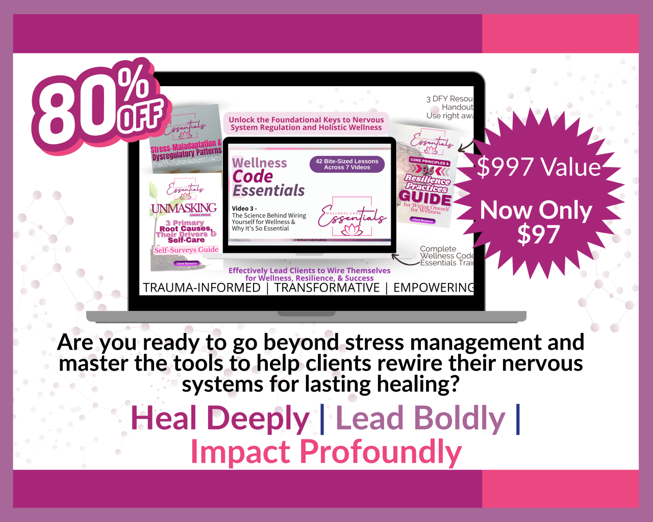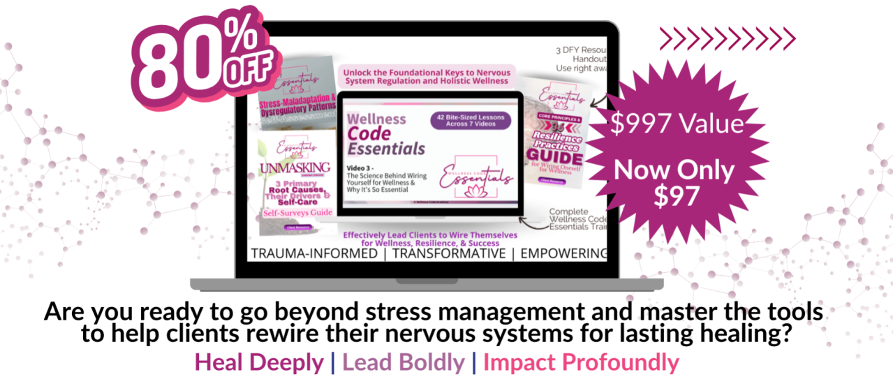 We help wellness practitioners break free from the protocol-driven, supplement-heavy approach by mastering a truly holistic, trauma-informed framework that interweaves physiology and psychology—empowering you to create lasting transformations, elevate your coaching confidence, and build a thriving, stand-out practice.