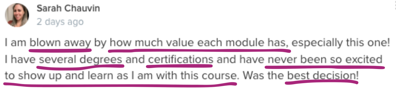 These sessions offer direct interaction with Jen and Sara, collaboration with fellow students, live coaching support, case study reviews, and the chance to deepen your knowledge and confidence as you progress through the program.