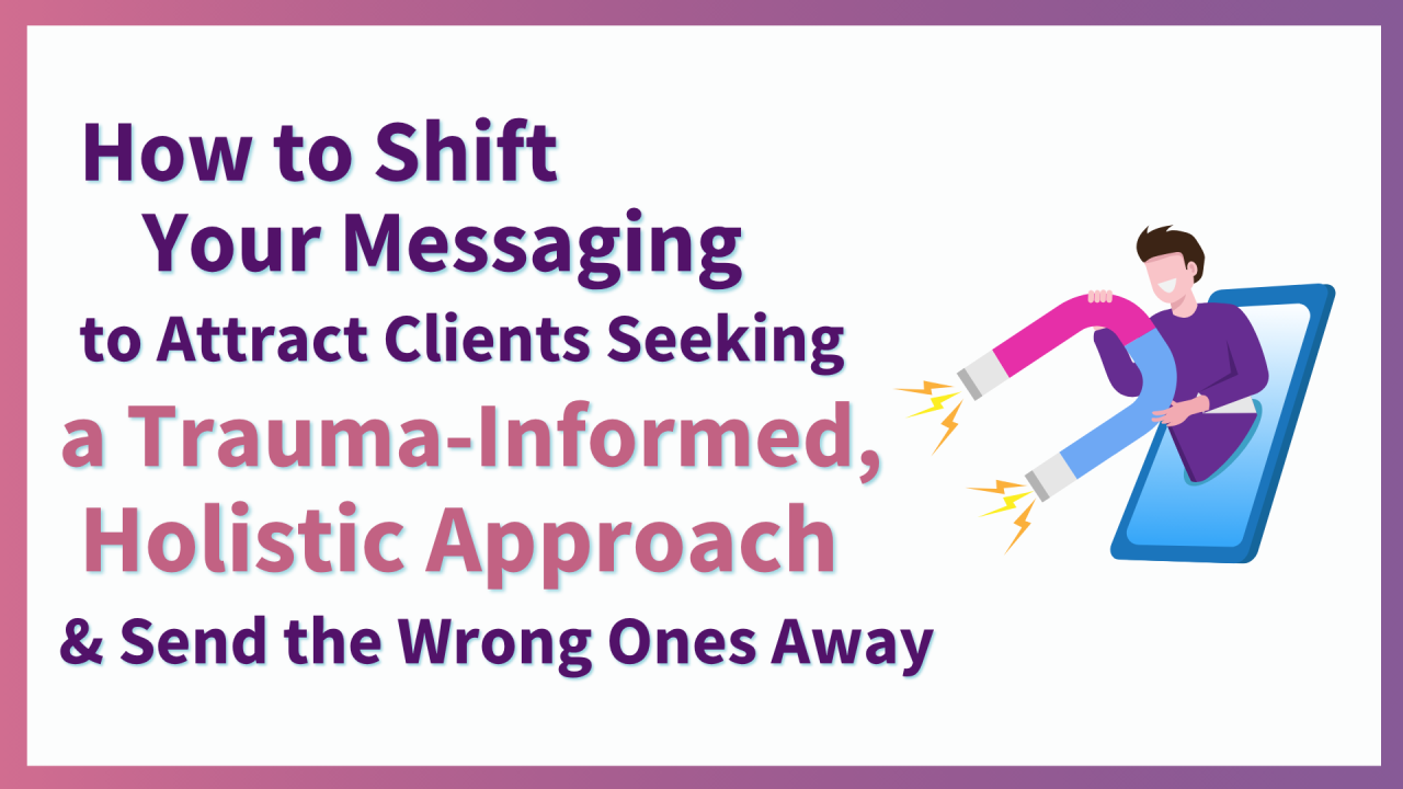 In this lesson, we will discuss how to craft strategic messaging that attracts ideal clients seeking trauma-informed, holistic healing while repelling those looking for quick fixes or expecting to be "fixed" by practitioners. We will learn how to develop core message statements that communicate our approach across all platforms — social media, discovery calls, and websites — to ensure we attract coachable clients willing to take full responsibility for their healing journey.